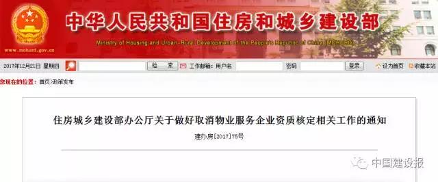 住建部日前印发《关于做好取消物业服务企业资质核定相关工作的通知》(建办房[2017]75号),要求各地落实《国务院关于第三批取消中央指定地方实施行政许可事项的决定》(国发[2017]7号)和《国务院关于取消一批行政许可事项的决定》(国发[2017]46号),做好取消物业服务企业资质的后续管理工作。